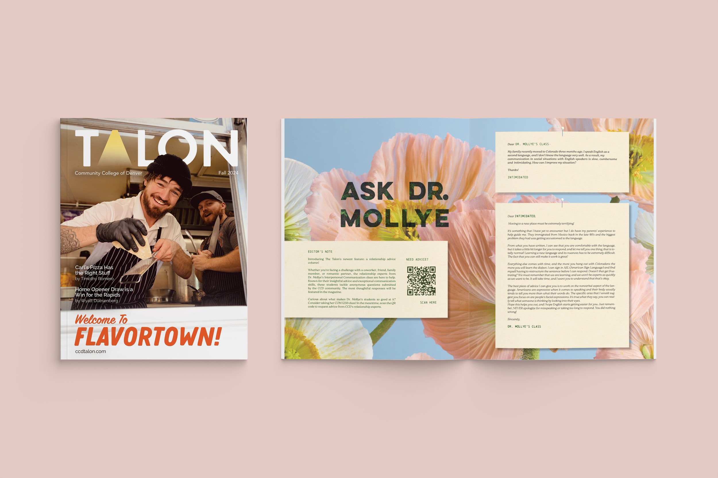 A selection of design work for CCD’s biannual Talon Magazine, which showcases student journalism. I designed the cover and several interior spreads for this issue. Shown here is a spread for a new advice column, where readers anonymously write in for guidance from Dr. Mollye and her class.